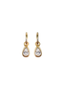 These earrings feature a plated gold design, each showcasing a glass stone. With a length of approximately .75”, these lightweight earrings attach with posts and provide a comfortable fit, making them perfect for all-day wear and special occasions. The design exudes sophistication, bringing a touch of luxury to everyday styling.